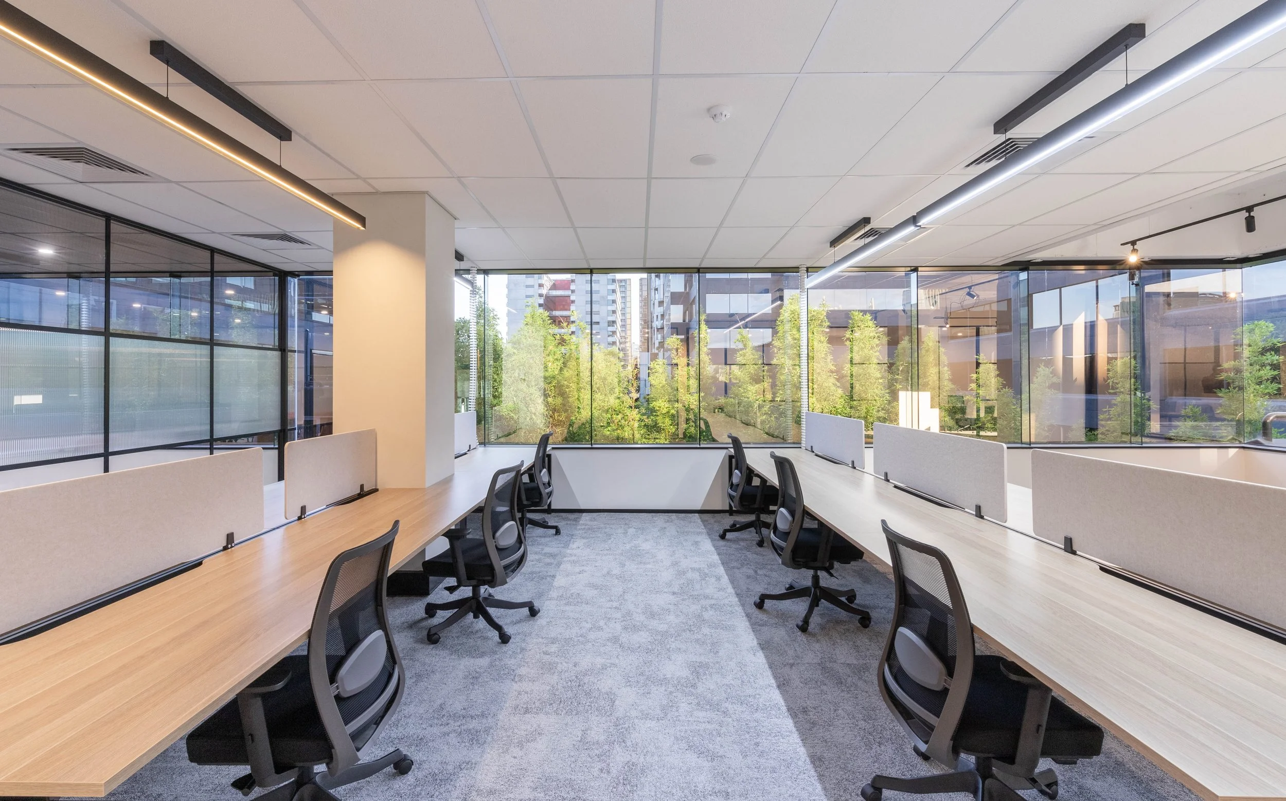 Partitioning, painting, flooring, mechanical (HVAC), plumbing, electrical & data, fire services, and custom joinery.
